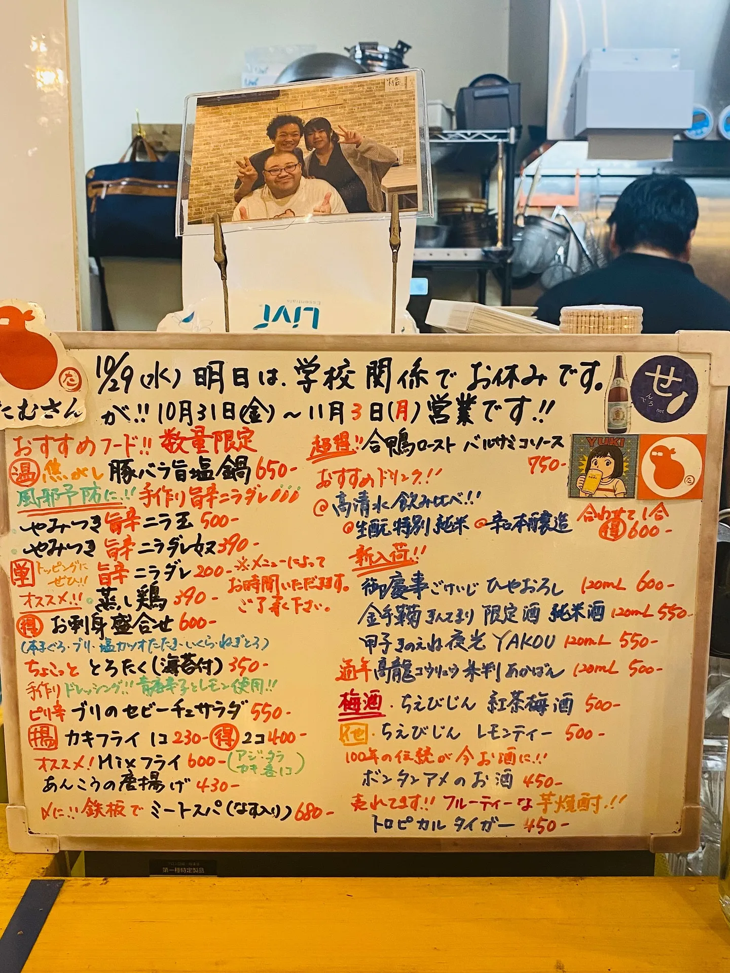 お疲れ様です‼️ 2025/10/29 お疲れ様です‼️ 今日のホワイトボードです‼️ 明日、お休みいただいております🙇🏻♀️ ですが⁉️10月31日から11月3日までは、営業いたします‼️ 祝日月曜日も営業いたします‼️ 今宵は、穴場だと思います‼️お待ちしております🙏 #大塚 #セルフ酒場たむさん